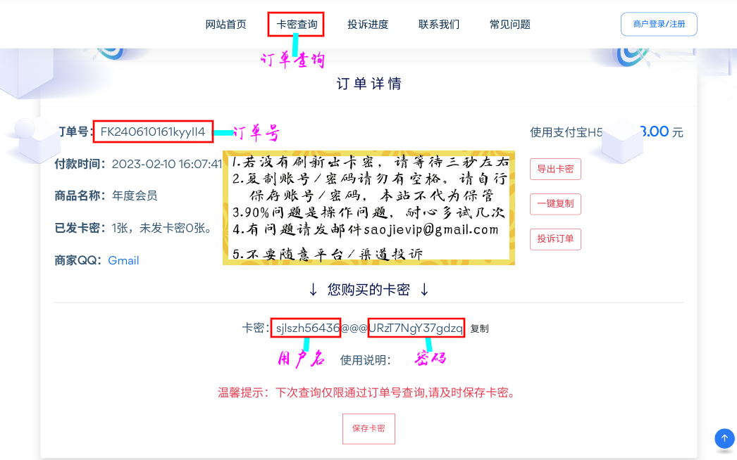 - * 1.支付购买后,不要关闭页面等3-5秒自动转跳页面,也可以通过联系方式查询订单。出现诸如" 卡密:sjlszh01@@@tcm79 ”其中" sjlszh01 "为会员用户名账号。" tcm79 "为登录密码, 账号/密码随机生成,请用户自行妥善保管账号密码,本站不代为保管获取到用户名和密码请复制粘贴使用,手打容易出错。『解释说明图片』